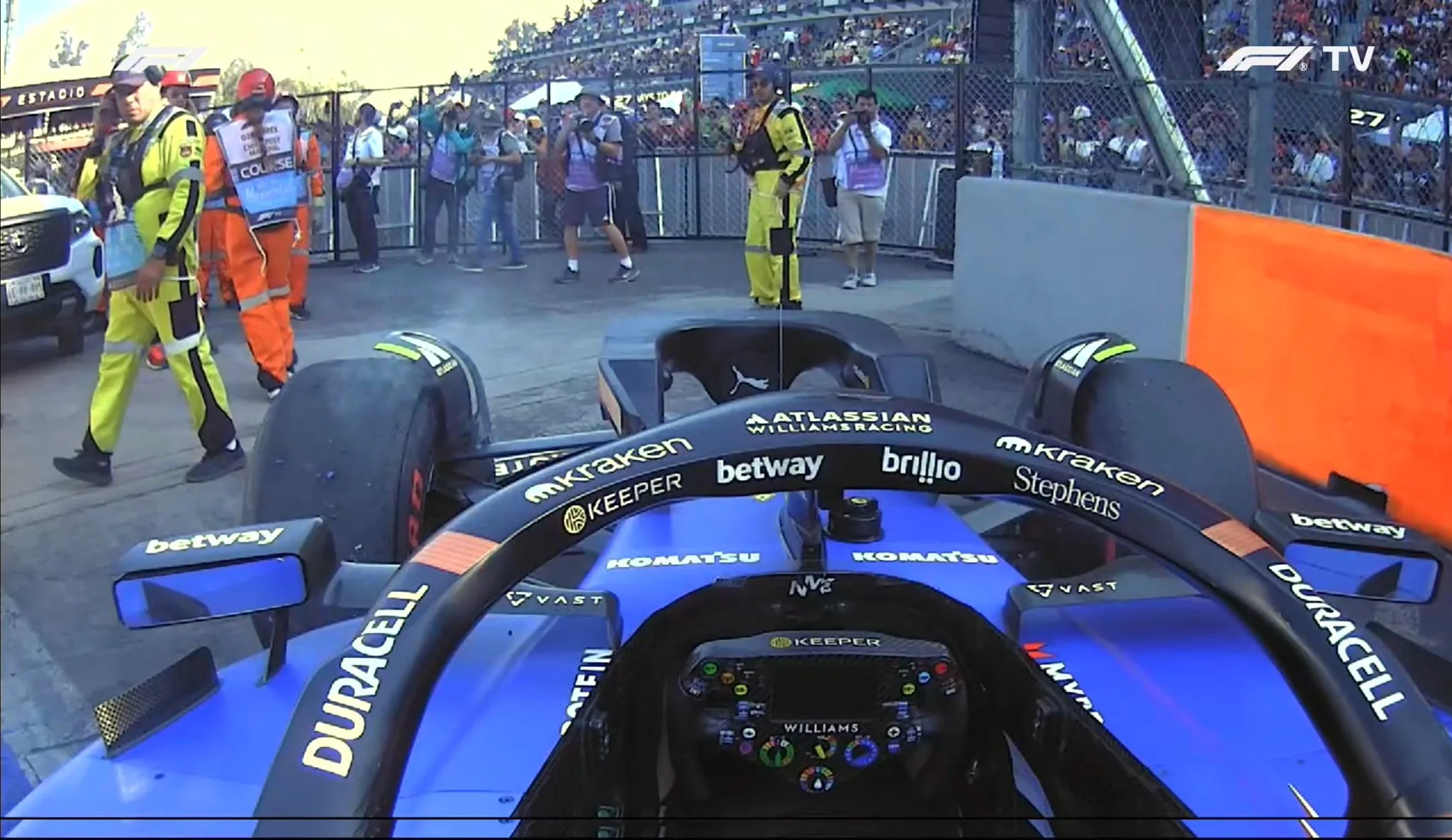At the race start, Liam Lawson had a contact with Carlos Sainz and lost pieces from his front wing, he was forced to come into the pitlane and switch for a new one. By lap 3, the marshals jumped into the track to pick up all the debris as the race was going on. Suddenly, Liam Lawson showed up at full speed and narrowly avoided those marshals at turn 1.